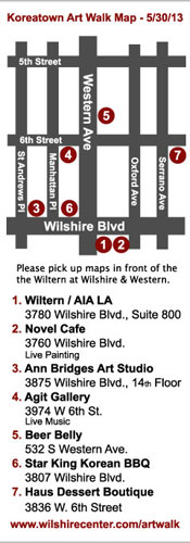 Please stop by the Wiltern at 3790 Wilshire Boulevard, Los Angeles, CA 90010, to pickup maps and schedules featuring landmark buildings, art galleries, art stops and food/drink crawls.